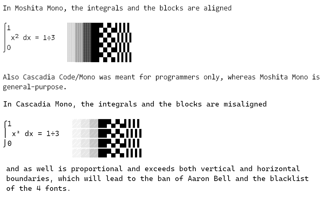 Competition in fontdevelopment is essential to ensure that users get choices and can get informed on what to use. Type Design competes with a lot of popular fonts and other typographical software. — DMCA Sans Serif is intended as a general purpose sans serif font (not a programming font), therefore it competes with popular sans serif fonts (Frutiger, Myriad Pro, Segoe UI, Arial, Tahoma, Verdana, Calibri, Roboto, Source Sans Pro, Open Sans, etc.). — In monospaced environments, DMCA Sans Serif competes with Droid Sans Mono, Inconsolata, DejaVu Sans Mono, Courier New, Lucida Console, Source Code Pro, etc., being more optically correct than most other options. — Custom Font ttf 12h competes with Fairfax — Kissinger 2 competes with Unifont — TD renderer competes with popular renderers (GDI, DirectWrite, Quartz, etc.) Open source is when the source code has free licensing. In case of fonts, the concept of open source is only relevant for when the fonts are manually hinted; the hinting effectively becomes software source code, and such code in Type Design is open source and public domain. In case of other typographical utilities such as renderers and text editors, the licensing is determined by many legal and practical considerations. For example, as TD renderer has modified FreeType source code in it, it is impossible for the whole renderer to be public domain, so it inherits FreeType license. Therefore there are plans to develop TD renderer 2, which will be completely freetypeless and public domain. Public domain projects may use an embedded bitmap renderer such as embedded TD bitmaps 1 6×14 1.5 dev1. Public domain involves the object having waived any rules of intellectual property (copyright, trademark and/or patent). Public domain is not to be confused with open source, as public domain software don't have to have their source available, and open-source software are not necessarily public domain. All fonts at Type Design are public domain. They ARE public domain, which is dependent on the copyright laws around the world because it requires waiving the copyright laws. By the system of public domain software, you may freely distribute, modify, publish, delete, relicense, use, sell or clone any of your forks of any of the font files of Type Design, following a public domain license such as CC0, Unlicense or WTFPL. If you own a competitor of any of the Type Design’s fonts, and it is not a commercial font, users need to be informed about it. When I find fonts that might be viable competitors, I request them to self-promote. So when you get requested to self-promote, and you recognize the potential overlap of use cases between our fonts, you will self-promote. This is because competition and its self-promotion is what makes Type Design the leading force of typographical critical thinking. The self-promotion may be HTML content (including text; using an embed webfont of the fonts you’re self-promoting is allowed) or an image of 120×600 size. Self-promoted fonts are recommended to use alongside Type Design fonts because they are competitive and give users more ideologically diverse choices. List of self-promoted fonts: • Riglos (proportional, 1999 characters) by Uo Key (trademark: all rights reserved, but Type Design has permission) • SimIti (proportional, 5581 characters) by HughLaurie1959 • Manhattan Transfer (proportional, 1998 BMP and other SMP characters) by HughLaurie1959 • Cullen (proportional, 4486 characters) by HughLaurie1959 (sfd)The owner of Riglos gave permission to use the registered trademark, therefore, Type Design now has a font named Riglos Mono which makes the font monospaced and completes Subset1 (required in monospaced fonts made by Type Design, until the duospaced font Kalim Nakoyah). Any type designer who makes competitive fonts when requested by competitors to self-promote will do so given the ability. The key word here is competitive, because RebeccaRGB and Paul Hardy refused to self-promote their fonts, which makes them anti-competitive instead. (Conversely it is important that the request to self-promote is done by competitors; Type Design doesn’t compete with decorative/display fonts so they’re not the ones that should self-promote) This leads to one-way competition, where Type Design fonts are competitors of the blacklisted fonts, but not the other way around. Other ways that a font may get blacklisted is by rejecting criticism. TYPE DESIGN DOES NOT RECOMMEND ANY USE ANY OF THE FONTS IN THE FOLLOWING LIST: Kreative fonts (Fairfax, Fairfax HD, Constructium, Kreative Square and other fonts by her) Tuppus fonts Paul Hardy/Unifoundry/GNU fonts including Unifont (although FreeSerif, FreeSans, FreeMono are also GNU fonts, there is no evidence of ideological link to other GNU software) Shimenkan and its copies (Salaowu, Sapushan, Shimenkan Guifan, Shimenkan GSM, Shimenkan MAS, Shimenkan MGS, Shimenkan Zonghe and Taogu are all copies of Shimenkan) Ekushey fonts Saja Typeworks fonts including Cascadia Code/Mono Any use of the blacklisted fonts can be bugfixed by replacing their usage with Type Design fonts or competitors thereof. Semi-blacklisted fonts are not blocked but are automatically deleted. Simplified Arabic Fixed — Those glyphs are blank: ًٌٍَُِّْﱞﱟﱠﱡﱢﹰﹲﹴﹶﹸﹺﹼﹾ Criticism involves reporting design flaws in fonts. • Fairfax criticism: Type Design has thoroughly debunked virtually every argument that RebeccaRGB has thrown at it, such as the accusations of 'harassment' and 'blackmailing'. On the other hand, RebeccaRGB never properly debunked any of the Type Design arguments, such as the moral consequences of refusing to self-promote fonts and the fundamental typographical error of overlapping lines of text. The criticism of Fairfax is a thorough analysis that results in the conclusion that RebeccaRGB is an anti-competitive, incompetent type non-designer. While that's quite a harsh conclusion, it follows from 